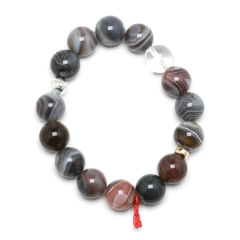 The beads are mounted on high strength elastic and also included in the bracelet is one Clear Quartz Bead, a Sterling Silver bead and a 14Kt Gold-Filled Bead.
